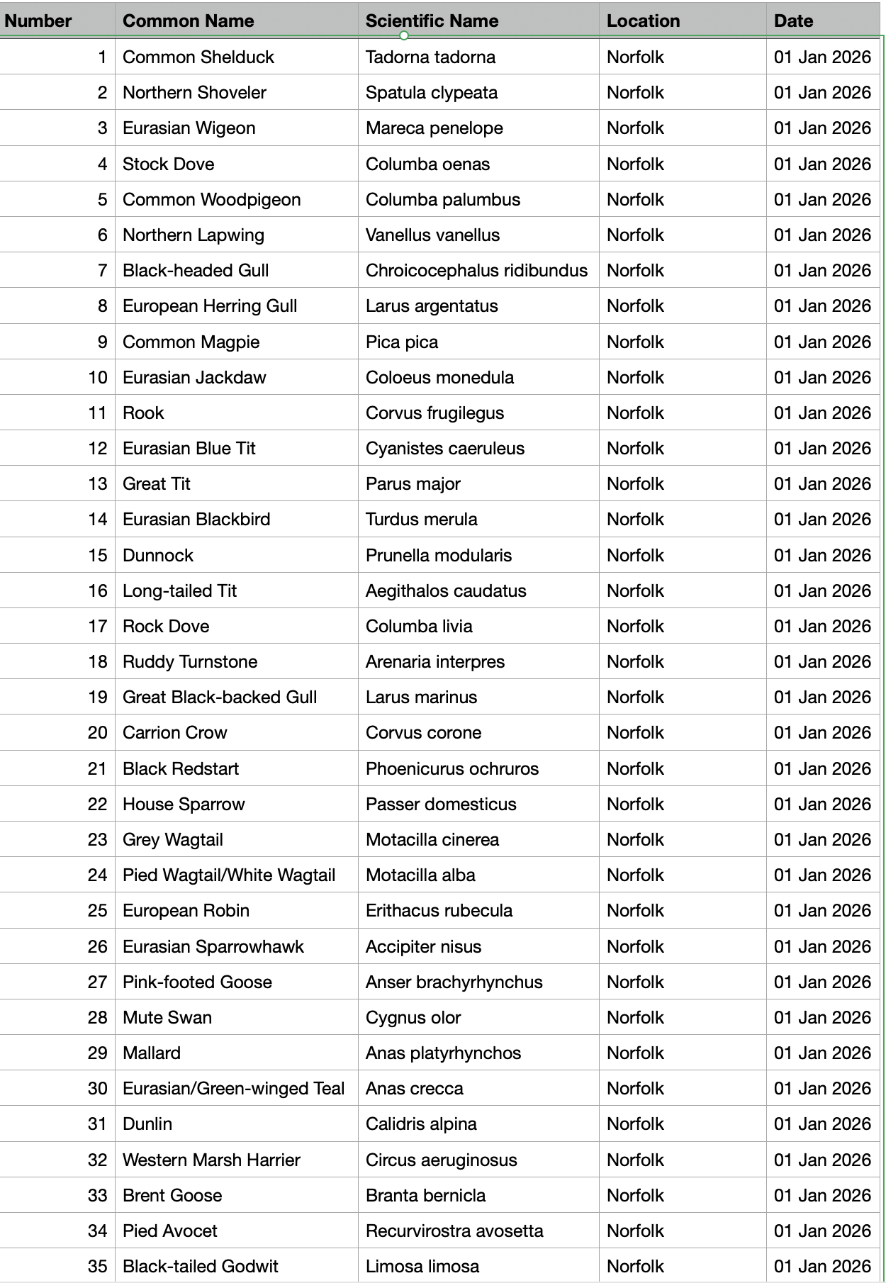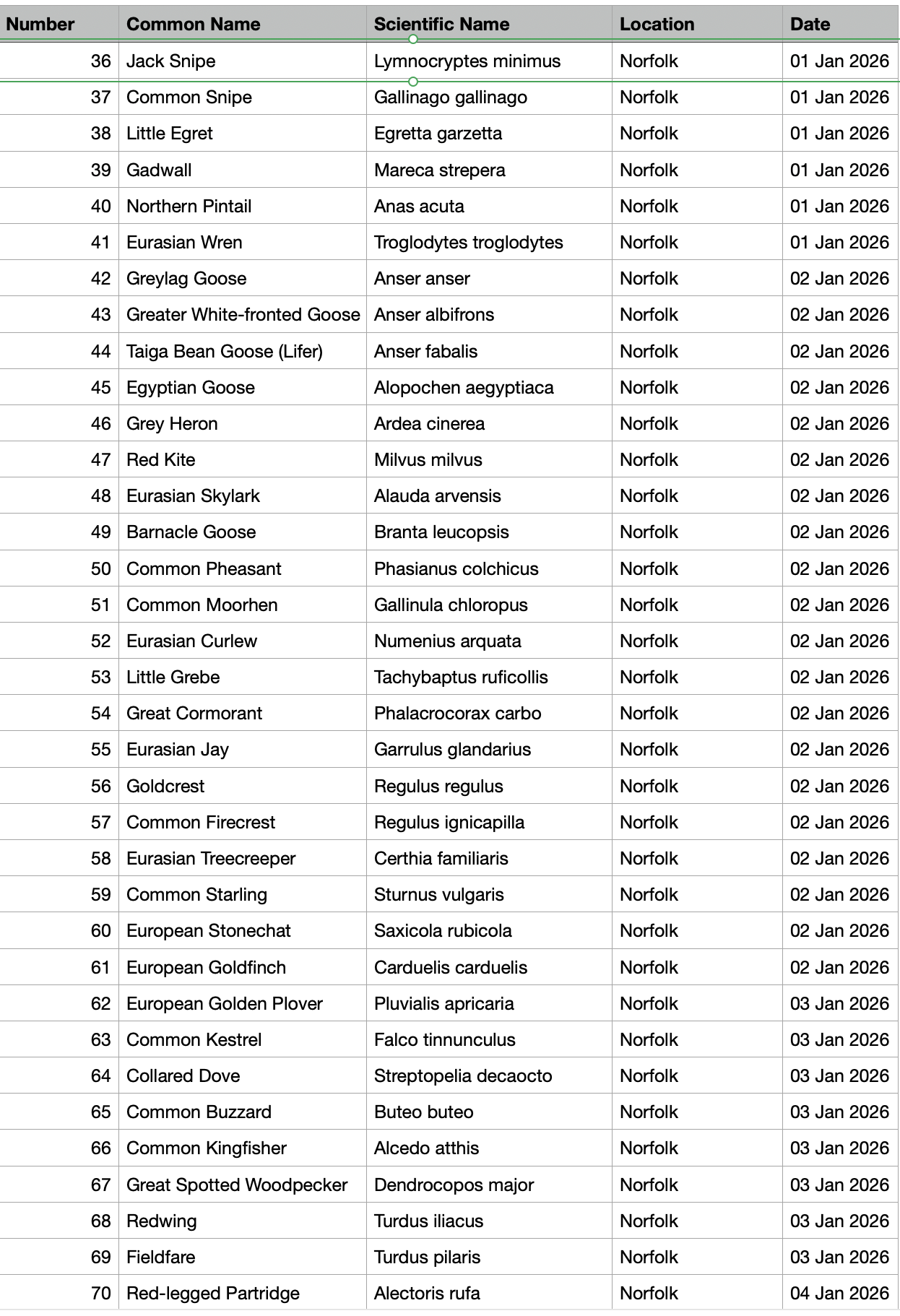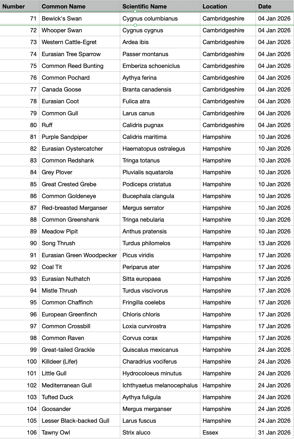 Birding diary - January 2026